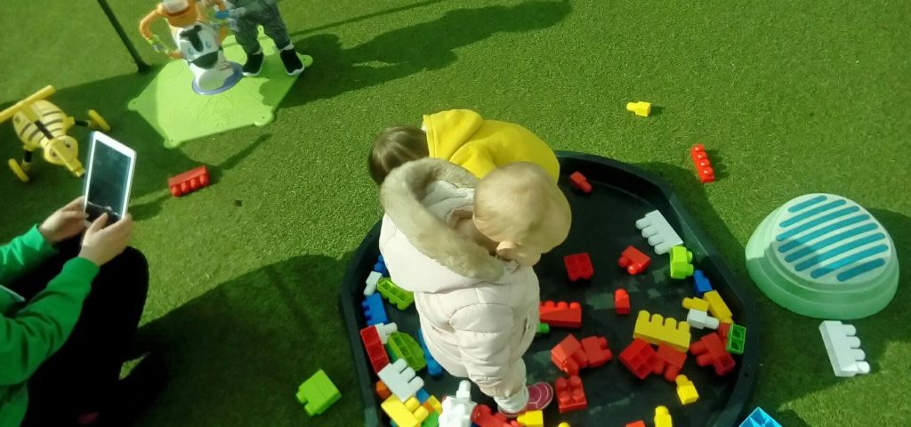 The adults encouraged the children to build their own structures and towers, developing their fine motor skills. Dragonflies also encouraged the children to talk about what colours the building blocks were - some children were able to name the colours when they were pointed at!